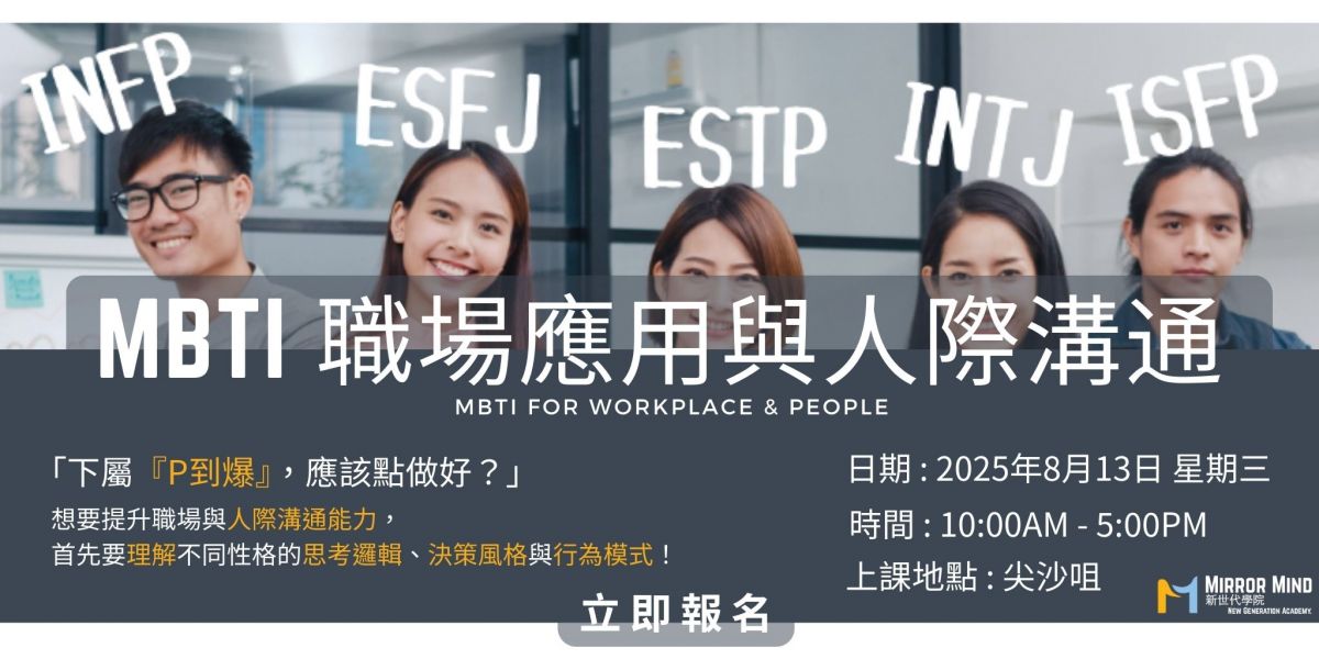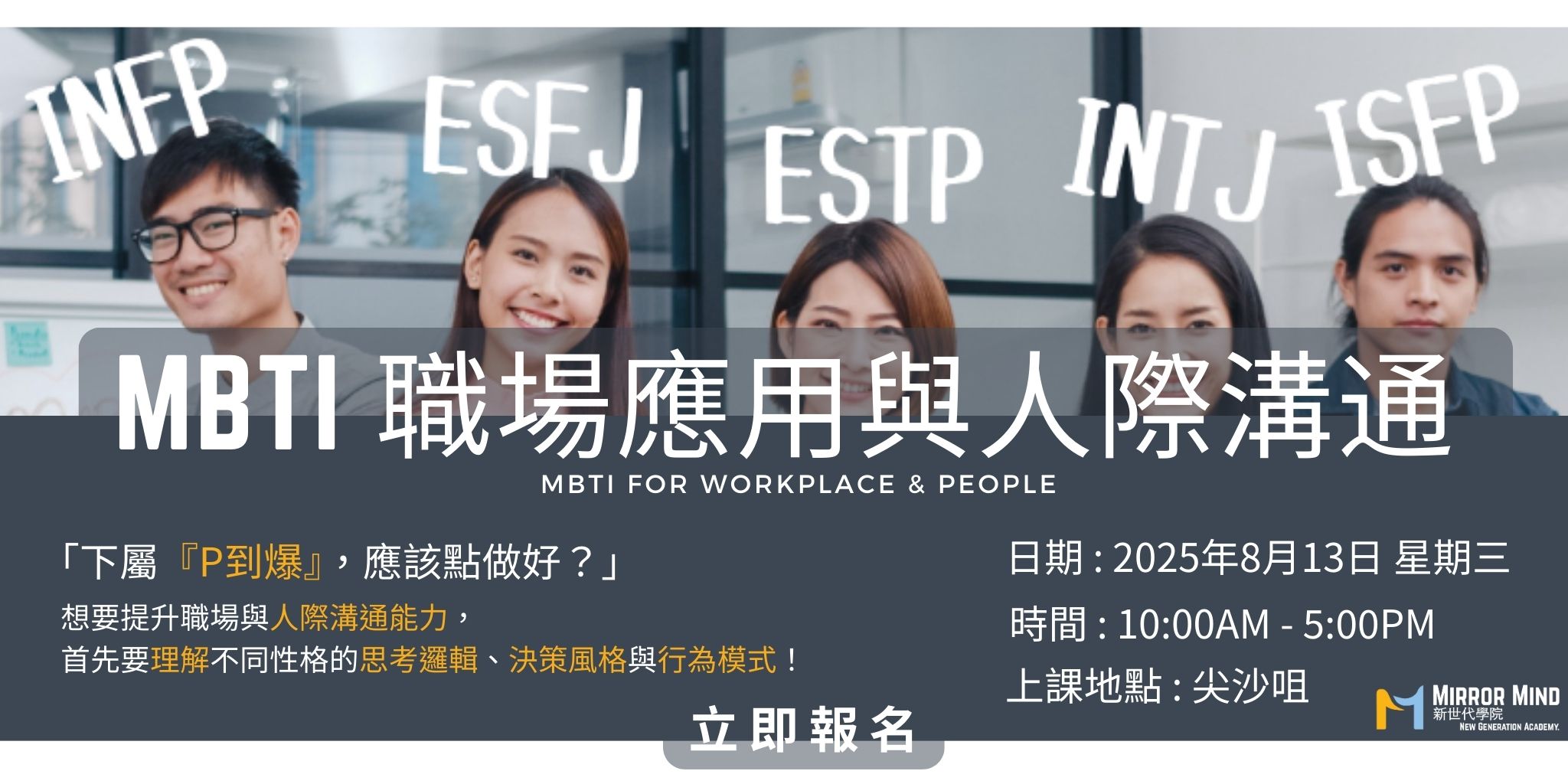 立即報名參加MBTI 職場應用與人際溝通的公開班課程,透過掌握 MBTI 幫助了解自己與他人的性格特質,學習如何調整溝通方式,提升職場效率,並運用於個人生活與人際關係中,讓你說話更有影響力、合作更順暢!歡迎機構合辦課程 / 合作!