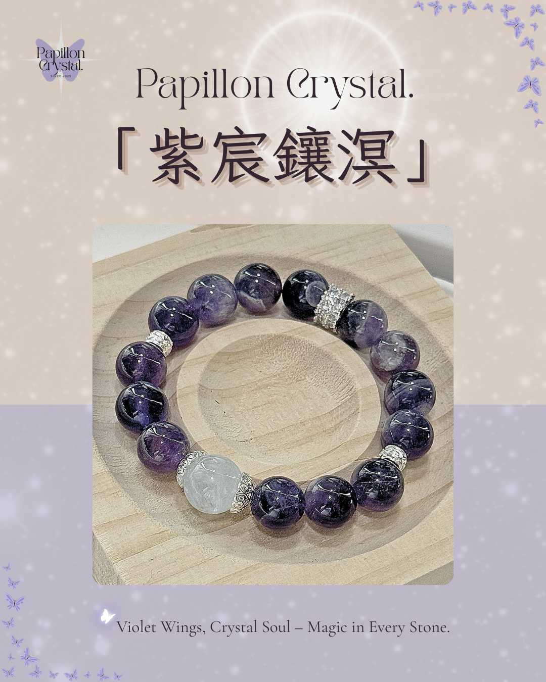 🔮店主原創水晶手鏈 by 𝑃𝑎𝑝𝑖𝑙𝑙𝑜𝑛 𝐶𝑟𝑦𝑠𝑡𝑎𝑙.🔮「石藏奇光,蝶境啟秘」🔮紫宸鑲溟🔮𝐻𝐾𝐷 $208**首次惠顧客人全部貨品可享9折優惠🔮紫水晶✧功效:提升智慧、加強記憶力、幫助思考✧對應脈輪:頂✧五行屬性:火🔮海藍寶✧功效:增強溝通能力及說服力✧對應脈輪:喉輪✧五行屬性:水🦋