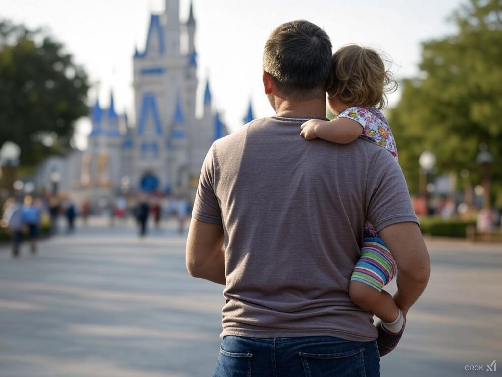 小孩沒有被安保人員的舉動騷擾到興致,騎在高大的男人肩上繼續大飽眼福,張口結舌地呆呆沉浸在心中幻想的樂園地。安保人員在男子面前掃視了他一輪。最後眼角斜視著他走回崗位,轉而掃視手中的電話。此時,小孩問男子:長大後我也要去迪士尼工作。可以嗎?