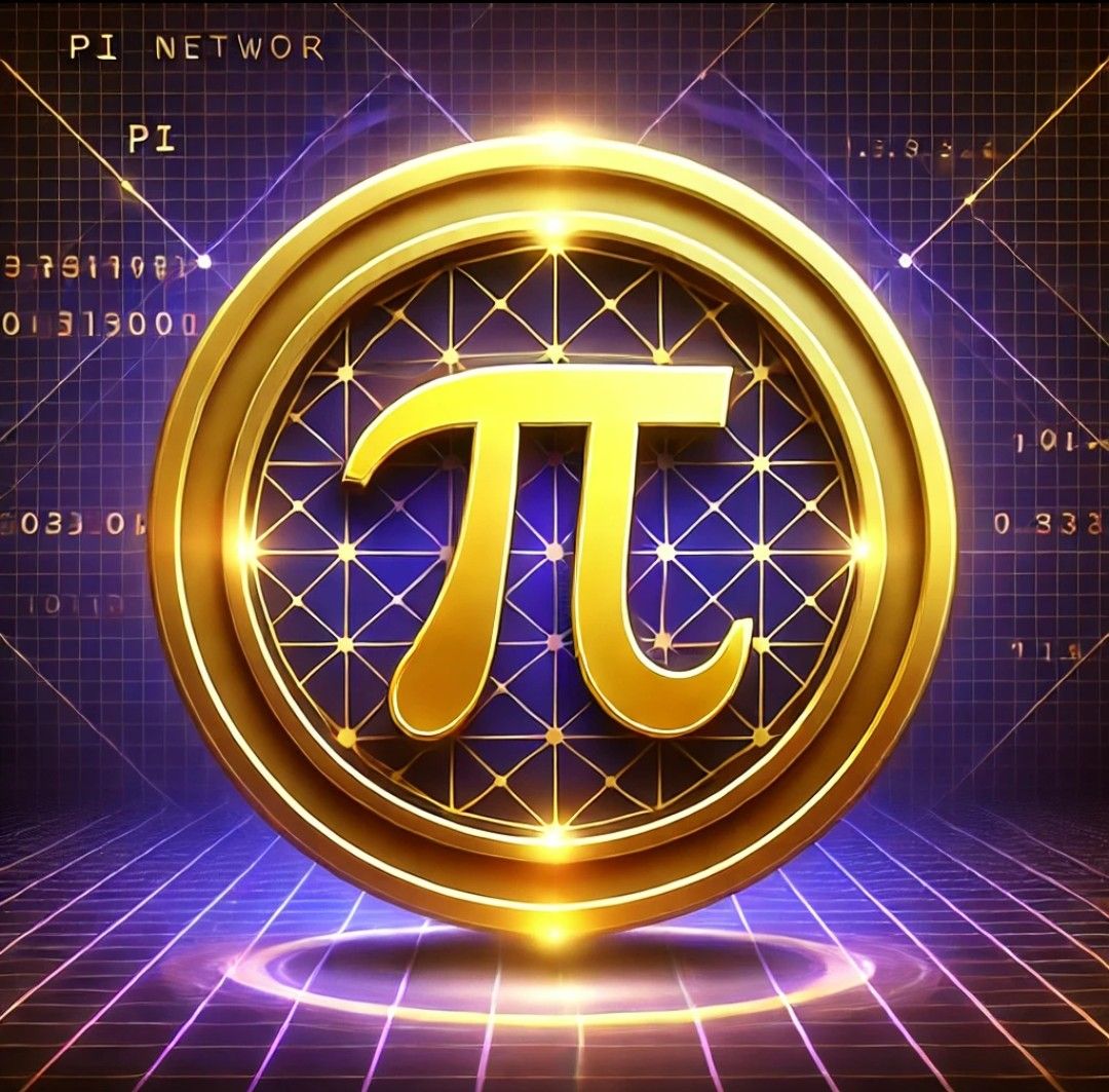 以金色圓形硬幣設計,中央有發光的 π 符號,背景帶有區塊鏈數字感。